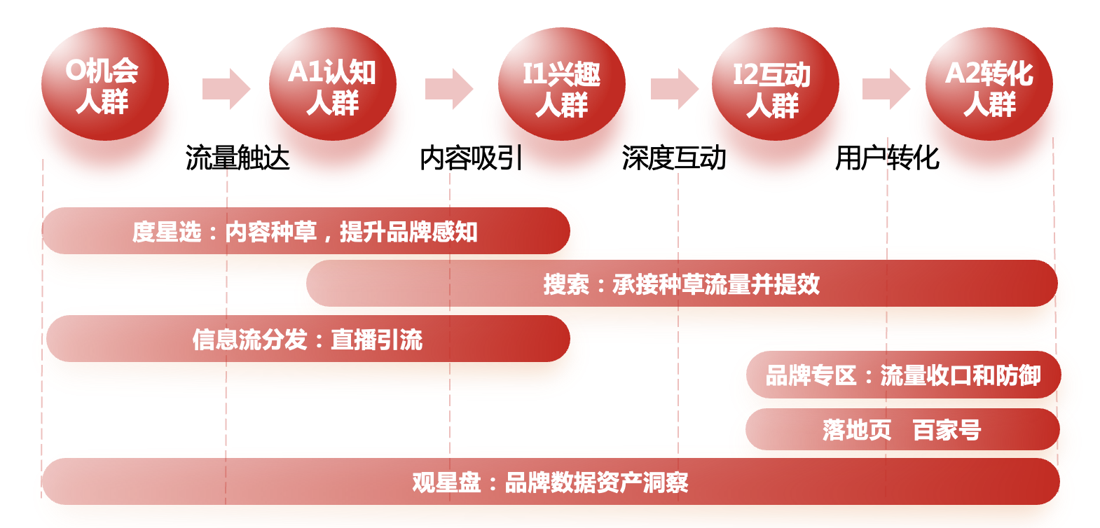 基于以上洞察,百度营销提出了“度星选内容种草 效果产品承接,聚焦提升I2人群”的总策略,以差异化产品布局承接不同阶段人群需求。前期锚定财经相关,通过度星选进行内容种草,提升品牌感知,再通过信息流分发的方式引流到内容;后期通过搜索承接种草流量,品牌专区则作为流量收口和防御要塞。