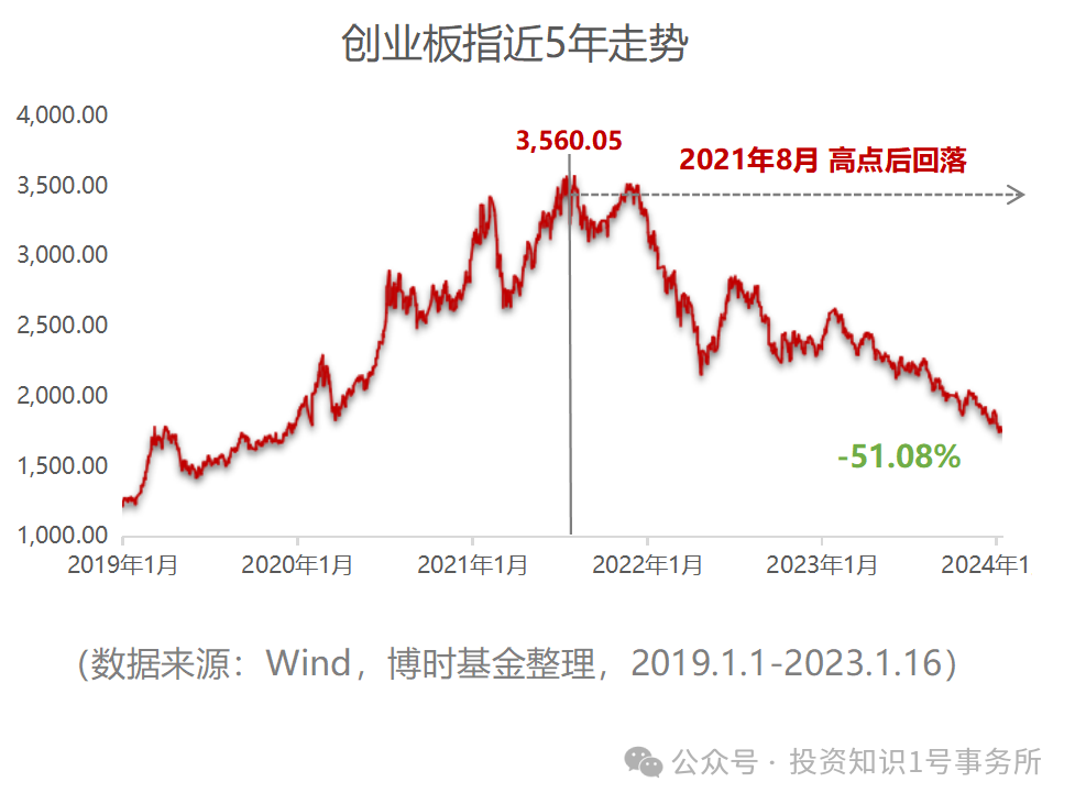 昨天创业板又大跌了,收跌-3%。回顾过去五年,创业板指经历起起落落,先是超两年的强势行情,点位屡创新高,在21年8月创下3560点的高位后,便开启下行。截至目前,创业板指较前期高点跌幅已经超过50%,腰斩了。