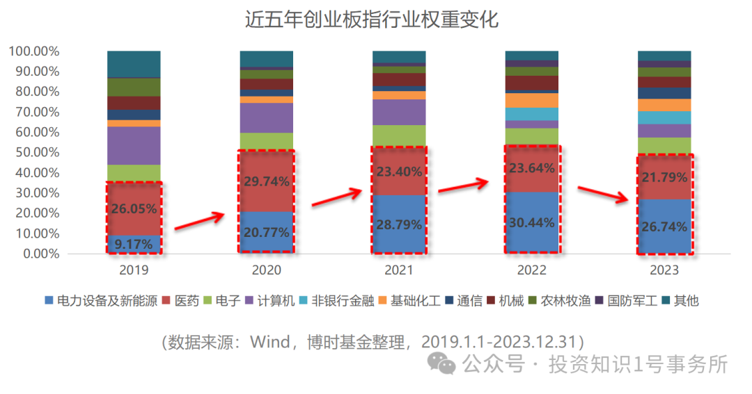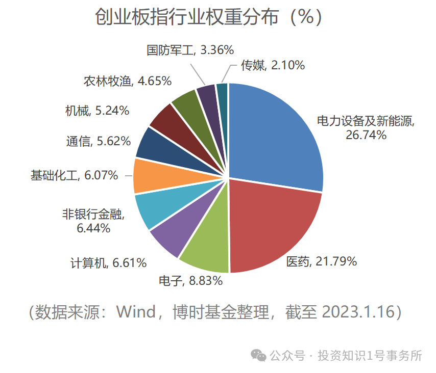 从指数成分上看,创业板指前十大重仓股主要为电力设备及新能源、医药等产业链龙头企业。在其行业分布中,新能源就占据了近三成的权重,其中某龙头股已经占到近15%。