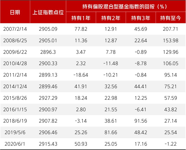 在指数“水位偏低”的2900点买入基金产品,拉长时间来看,整体的收益率情况还是不错的。以偏股混合型基金指数作为测算对象,以上证指数历史上的典型2900点进行回测,结果如下: