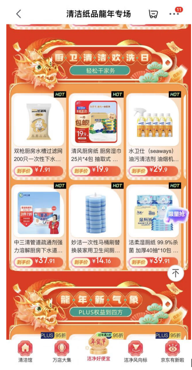 年货节期间,京东超市更是推出“厨卫革新计划”用品专场,覆盖清洁纸品、清洁用具、家庭环境清洁三大品类用品,清风、妙洁、威猛先生等27个品牌的34款家庭清洁产品带来惊喜好价,**降至4.9元。消费者前往京东APP,搜索“洁净龙年真5折”,即可直达专场选购。