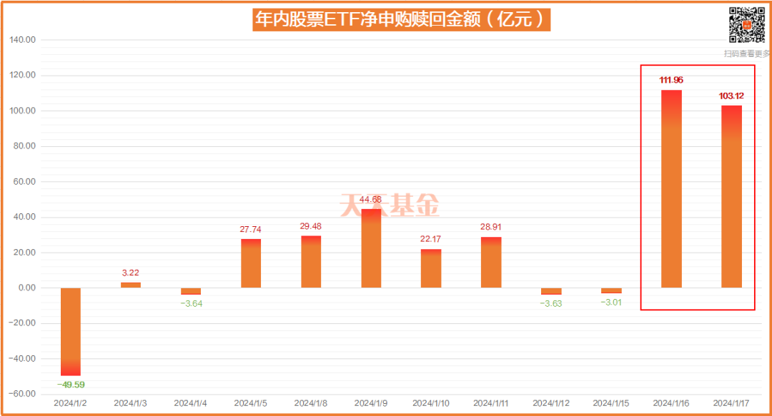 银河证券基金研究**数据显示,截至1月17日,**场835只股票ETF(包含A股ETF及跨境ETF)合计资产净值为1.52万亿元,连续两天出现百亿资金净流入现象。