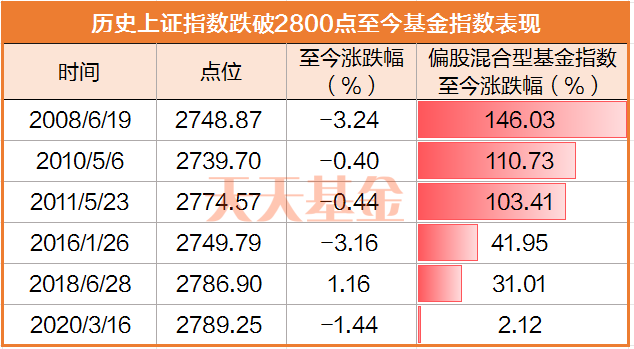 从过去这6次跌破2800点至今偏股混合型基金指数的表现来看,**都收获了正收益,并且**的一次至今累计涨幅超过了140%。