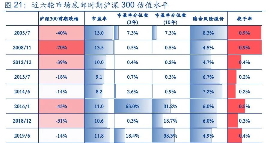 对于底部的特征,安信证券认为“市场底部通常成交活跃度较低,换手率处于低位,股债性价比大幅提升,破净股和低价股数量大幅增加,个股出现大范围破位和超卖。一般而言,市场底部需要伴随成交量收缩或者换手率的验证会更为稳妥,历轮市场底部区间成交量平均较前一轮上涨期减少约1/3。缩量不是充要条件,但主动多头偏向于是充分条件。”
