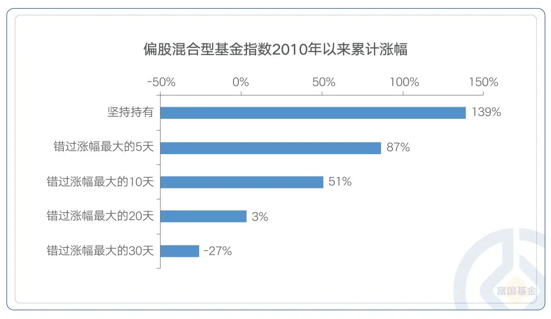 再看看偏债混合型基金指数2010年以来涨跌情况,全程坚持持有,如果错过其中涨幅**的5天也好,10天也罢,收益率水平都会大大下降,所以,择时可能会让我们失去更多。