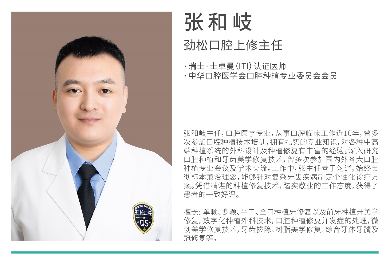 张和岐主任,口腔医学专业,从事口腔临床工作近10年,曾多次参加口腔种植技术培训,拥有扎实的专业知识,对各种中言端种植系统的外科设计及种植修复有丰富的经验。深入研究口腔种植和牙齿美学修复技术,曾多次参加**外各大口腔种植专业会议及学术交流。工作中,张主任善于沟通,始终贯彻标本兼治理念,能够针对复杂牙齿疾病制定个性化诊疗方案。凭借精湛的种植修复技术,踏实敬业的工作态度,获得了患者的一致好评。
