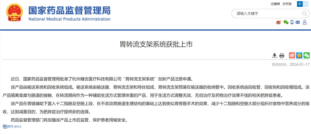 1月17日,杭州糖吉医疗科技有限公司的胃转流支架系统经**药品监督管理局批准,获批全球**肠道介入**肥胖症创新医疗器械三类证 !