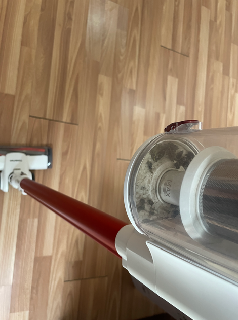 斐纳TOMEFON的尘杯是全透明的,吸入灰尘随时可以掌控,同时斐纳TOMEFON还有专门的灰尘倾倒按钮,一键倒尘设计不仅挺好玩而且确实也倒得很干净,因为之前在网上看到过很多人吐槽吸尘器滤网不好清理用久了发臭的现象,所以我在测试的**还拆开了斐纳TOMEFON的尘杯滤网,感觉拆卸起来**没有难度,不仅不需要专业工具甚至不需要专业知识,像我这样的机械小白也能轻松拆装清洁,安装之后如果没有卡紧触控屏上的感应器还会闪灯提醒,在智能配置方面确实设计得很贴心。然后斐纳TOMEFON比较容易脏的内置螺旋尘刷也有一键拆洗按钮,用完后像我这样的机械小白也可以轻松的不借助工具徒手将地刷**拆卸清洗一遍,斐纳TOMEFON的陈列架上甚至还贴心的设计了刷头晾晒区域,吸尘器的事后清理工作能设计到这个层面也确实相当接近**了。