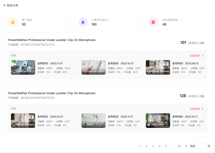 针对竞品品牌在TikTok美区推广的所有商品,用户在WotoHub内也可以轻松获取推广商品总量、小黄车挂链红人数目、发布视频总数的数据,每个商品关联的红人数量和带货视频数据也一目了然。