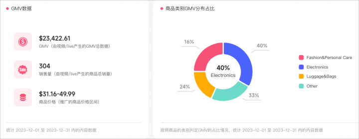 通过新版红人详情页,用户在WotoHub内可直观获取到目标红人在TikTok美区小店所创造的GMV数据、产品销量、产品客单范围以及商品类别GMV分布占比数据。