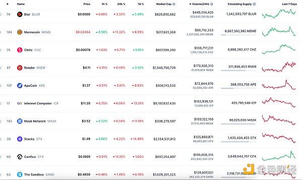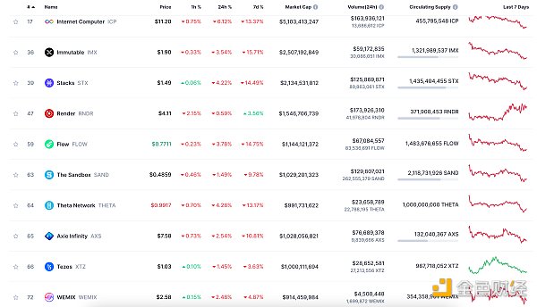 24小时NFT交易量、交易量前十项目 数据来源:Coinmarketcap