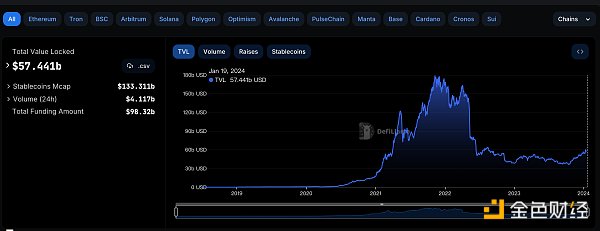 3、DeFi中锁定资产:574.41亿美元