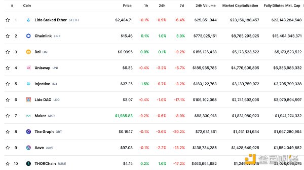 DeFi总市值及前十** 数据来源:coingecko