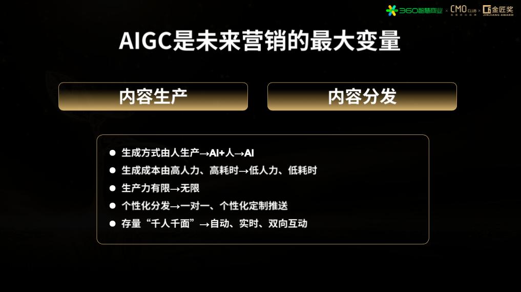 1月17日,拥有“营销界奥斯卡”之称的第七届CMO营销价值峰会暨金匠奖颁奖盛典在京举行。以《AIGC 品牌营销的变与不变》为主题,360集团商业化市场部总经理李佼带来AIGC赋能品牌营销实战经验分享。