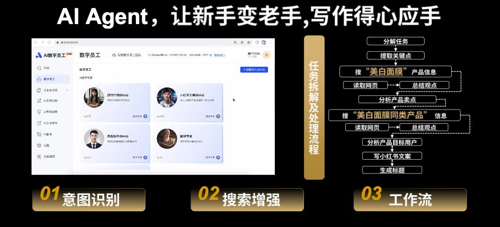 以文生文场景为例,李佼在现场向360AI数字员工下达了“撰写一篇小红书文案”的目标任务。在经历了分析产品卖点、分析目标客群、通过搜索海量网页读取竞品信息和行业热词等工作流程,**交出一篇“有理有据”的文案内容。通过将专家级的经验拆解为结构化的工作流程,360AI数字员工让营销小白快速进阶为金牌文案。