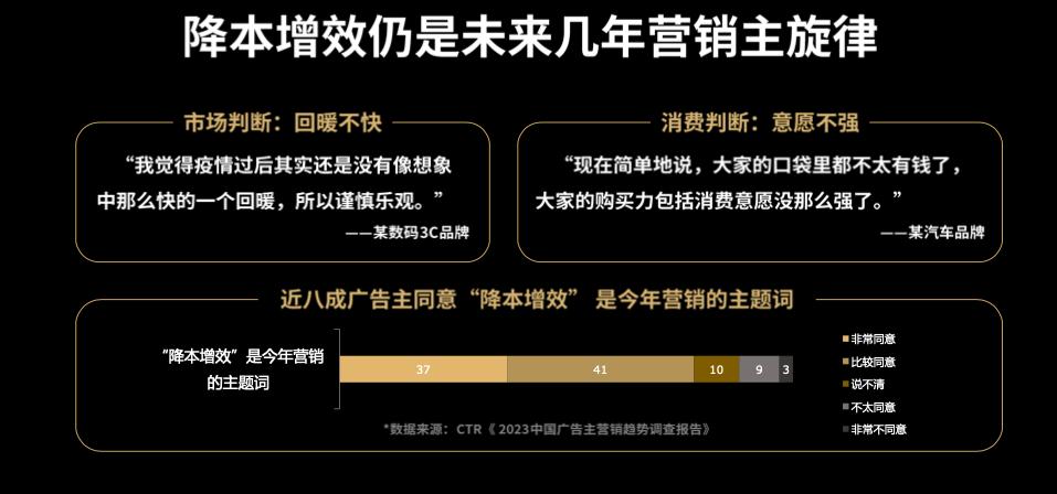 而“如人饮水,冷暖自知”,作为距离消费者最近的触点,市场最灵敏的试金石,营销行业对市场感知更为直观而深刻——身处长期品牌建设与短期营收的双向压力之中,广告主们“口头乐观,手头谨慎”,“降本增效”依然是未来几年营销的主旋律。