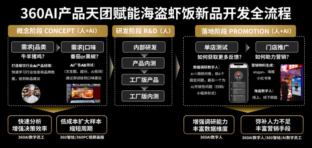 以“一碗盛满AI的牛肉饭”为例,李佼详解了360AI系列产品赋能海盗虾饭新品开发的全流程。