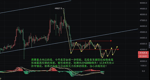 经历了长达5天的震荡,终于在昨天出现下探,震荡区间依旧在4万上方,对于喜欢做波段交易者来说,等待的煎熬已成常态,结果还是比较理想的,前面我也说过了43000若能持续成为压制,那么二次下探是必然的结果,其原因不必再多说,市场行为,市场情绪所导致。只是超出了**的预期,计划在41300附近周线均线附拉止跌,但昨晚还是插破了均线,触及到前期起涨买盘支撑附近;