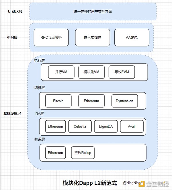 模块化Dapp L2,可划分为UI&UX层、中间层、基础设施层: