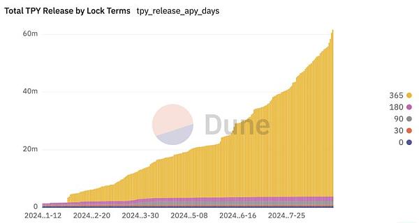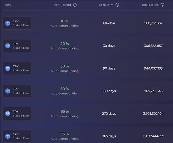 协议的整个经济模型不**且没有收入,只拥有一个质押挖矿的Dapp——在ETH\Arbitrum上质押tpy。长期以来,也只是通过吸引散户质押**锁仓来控制tpy的流通盘,来减小拉盘的阻力。而挖矿收益的分布也**简单**,根据不同的锁仓时间来获得对应的币本位挖矿奖励。