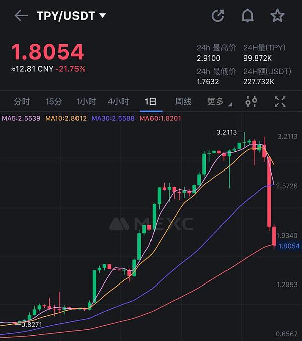 从链上数据也可以看得出来,项目方多签钱包一直在向交易所内转账出货,在昨天,tpy迎来大额解锁,ETH、ARB两条链共计解锁25万颗,其中仅3万颗充入火币的解锁抛压就把tpy砸到腰斩,一批用户被割得惨不忍睹。但是这才是开始,因为剩余的22万颗**随时有可能会砸向市场,项目方也无力护盘。根据链上质押数据,tpy将在本月底再次迎来百万级别的质押解锁,届时tpy的价格大概率将崩盘,直至归零。也许在崩盘之前,项目方还会出各种利好,进行一波诱多的操作,但这大概率是崩盘前的**一波拉升,因为大量抛压将进入交易所是不争的事实。这类项目也许看似短期繁荣,但崩盘往往发生在一瞬间而且很难预测,在**的结局都是归零。