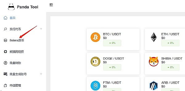 首先,我们打开pandatool的官方网站:https://pandatool.org/,在左边菜单栏找到“Solana发币”,点击进入发币页面