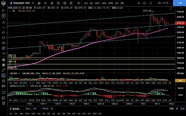 以太坊昨日一路上行**反弹至2500一线受阻回落,**跌至2415一线支撑多头迅速拉回,恭喜跟上昨日思路的朋友空单获利85点,目前币价在2480附近运行,四小时级别k线向下插针后迅速反弹拉回以大阳收线,但多头却没能延续,上方整体受ma14均线压制,短期连阴回落,macd空头缩量双线粘合,整体走势**没有方向以窄幅震荡为主,日线级别价格跌至前期的强压区域目前转为支撑,虽没破位但走势依旧很弱,仍有再次下探的风险,2400不破的话可以高空低多操作,上方压制2500-2530,下方支撑2440-2400