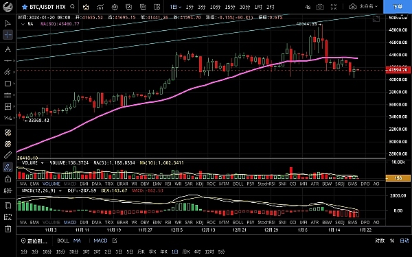 大饼昨日走势与思路一致白盘高位触及41568一线后受阻,晚间开始下跌,**至40285一线支撑迅速反弹,恭喜跟上昨日思路的朋友空单获利一千点,目前币价在41640附近运行,四小时级别行情如约下探4w附近但没有跌破,k线由阴转阳,macd空头逐步缩量双线粘合有金叉迹象,短期空头暂时止跌,但多头反弹力度也不强,整体走势**,上方有ma14压制若无法站稳则还有震荡下行的可能,日线级别空头逐步放量成死叉状态,前期多次都未打破的ma60转为压力线,短期不会那么容易突破,周末波动不大建议高空低多对待,上方压制42000-42500,下方支撑41300-40700