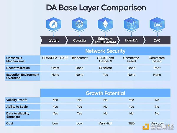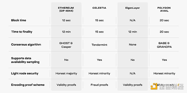 在共识机制中,存在着一个根本性的两难问题,即有效性和安全性,前者确保交易的快速处理,后者以确保交易的准确性和安全性,为此不同的区块链系统会做出不同的选择以达到符合自身实际需求的平衡。其中 Ethereum、Celestia、EigenLayer 和 Avail 解决方案都旨在为 Rollup 提供可扩展的数据可用性,根据 Researcher@likebeckett 和 Avail 官方提供的相关数据,我进行了以下总结。