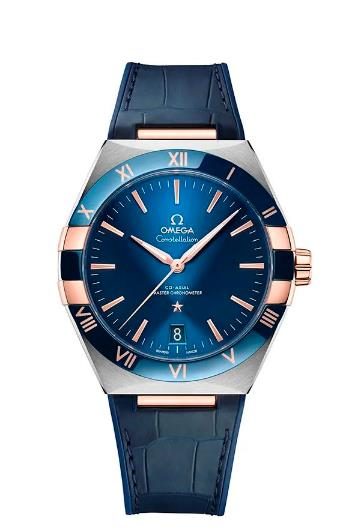 41毫米表壳也采用了精钢与Sedna 18K金制成,呈现双色的金属光泽。抛光蓝色陶瓷表圈为手表增添了现代感的运动风格,借由欧米茄Ceragold技术,将过往星座系列标志性的罗马数字保留在了陶瓷表圈上。