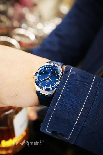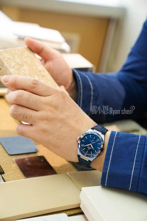 手表配备精准走时与**防磁的欧米茄8900**天文台机芯,具备日历显示功能。带有橡胶衬里的蓝色皮表带,兼具外观与舒适佩戴感,所有场合都能佩戴。