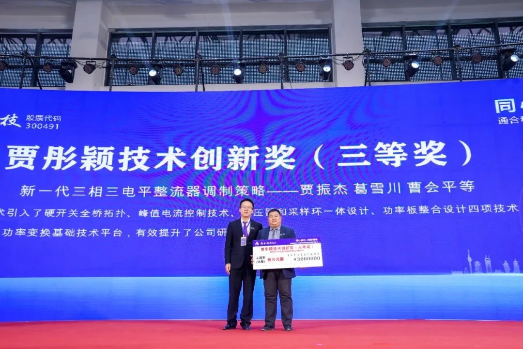 为鼓励研发人员大胆创新,刻苦攻关,活动现场马总为在技术创新和研发领域做出突出贡献的团队颁发了“贾彤颖技术创新奖”,该奖项是通合创始人之一贾彤颖老先生自费400万所成立的通合科技分量最重的奖项。通合科技自成立以来坚定地走“技术立企”的发展道路,坚持研发高投入,注重研发人才培养,通过一代代“通合人”不屈不挠、坚韧执着、传承奉献、同心同行,历经25年的发展,已发展为目前千人规模的上市公司。