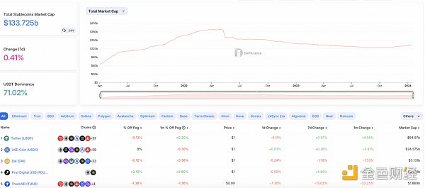 据Blockworks数据显示,截止2024年1月12日,美国现货比特币ETF上市首日交易量达到46亿美元,其中灰度的GBTC交易量超过21亿美元,贝莱德的IBIT超过10亿美元,富达的FBTC超过6.8亿美元。彭博社**ETF分析师Eric Balchunas表示,比特币现货ETF上市的两天里,九家发行机构已经吸收了 14 亿美元的资金,超过 GBTC 5.79 亿美元的流出,净流入总额 8.19 亿美元。无论是传统宏观基金还是超高净值人群,都为加密行业持续注入了大量的流动性。从另外的角度看,链上稳定币的体量也在不断增加,表明新资金开始持续流入。DefiLlama数据显示,稳定币总市值为133b美元,再创新高,其中USDT市值达94.9b美元,市占率为71%。
