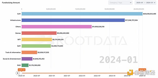 2020年1月至2024年1月,融资的品类除了CeFi,很大规模流向了基础设施、Games、NFT和DeFi。这些类型的项目,在熊市期间积累了足够的资金,在产品的交付上有**的保证,成为下一波创新浪潮的新标的。