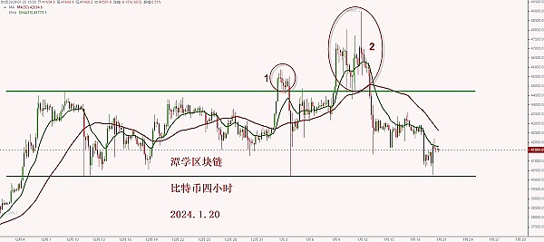 如果从矩形震荡的角度来看待最近一段时间的比特币走势,那么可以看到区域1和2是对矩形震荡上轨的假突破。