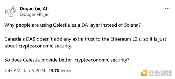 那么 Celestia 目前用在什么地方呢?Celestia 的主要用途是为以太坊上的汇总提供廉价的数据可用性。虽然这听起来不错,但有一个很大的缺点:使用 Celestia 的以太坊 L2 不能直接从 Celestia DAS 中受益。主要原因是无法在以太坊上验证 DAS。向以太坊证明 Celestia 的桥梁仅检查 66% 的 Celestia 验证者是否签署了交易,因此**以太坊 Rollup 都无法从 Celestia 的创新技术中受益。