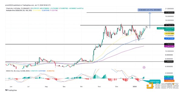Chainlink的LINK**在1月17日飙升7%,交易价格达到16美元,这是2023年12月29日的水平。这巩固了其作为市值**1大加密货币(不包括稳定币)的地位。