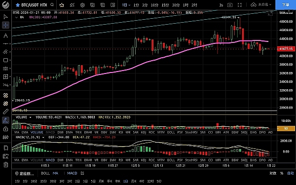大饼昨日整体波动不大,低位跌至41460附近支撑反弹,**触及41870附近受阻,目前币价在41687附近运行,四小时级别行情横盘震荡波动不大,macd多头运行双线金叉状态,但目前走势**,上行概率不大,预计不会突破42000关口,短期没有方向将维持横盘走势,日线级别空头止跌缩量运行,k线收下影线且底部抬高,关注反弹力度,macd仍是死叉状态,走势偏弱后市还有下探的可能,日内建议观望为主,上方压制42000-42500,下方支撑41300-40700