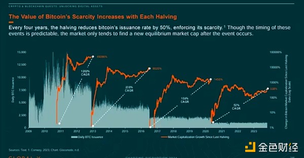 比特币上一次减半发生在 2020 年 5 月 11 日,当时区块奖励从 12.5 BTC 降至 6.25 BTC。 自该事件以来,比特币以 52% 的复合年增长率增长,其中最快的增长发生在事件发生后的前 9 至 12 个月。 2020 年之前的减半也产生了类似的情况。