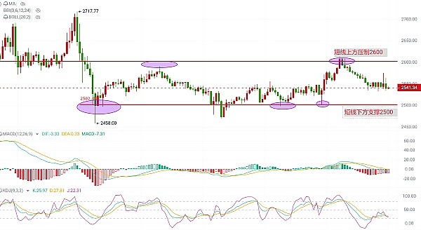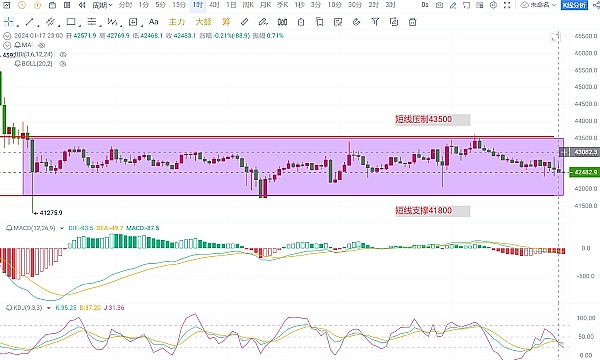 比特币小时图盘面可以看见,目前行情走出了一个明确的箱体,整体来看这个区间属于多空双方筹码密集交换区,这也是因为前一段时间比特币的行情冲高,导致多头筹码套利离场、空头筹码直接被拉爆,目前行情进入了一个筹码的真空期,不论是多头还是空头当前都需要时间和空间来进行筹集筹码,导致行情本周一直围绕着箱体区间盘整,我们的操作思路可依据箱体区间去把握,短线上方的压制位在43500附近,下方的重要支撑关注41800一带。结合附图指标来看,MACD当前不论是多头还是空头都出现放量不足,整体动能偏弱围绕零线附近运行,KDJ方面三线走平**缩口,有粘合向下的趋势,从四小时图上看会更为明显,这也衍生出了我对行情的整体看法,稳中向下,预计接下来行情会以慢跌为主。
