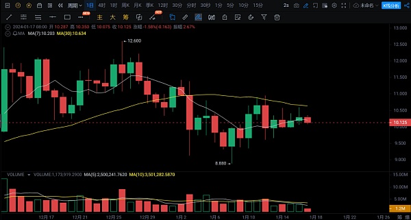 Co**os (ATOM) 的价格区间在 8.99 美元至 12.39 美元之间。 10 天移动平均线为 10.10 美元,100 天移动平均线为 9.12 美元。 关键支撑位为 3.98 美元和 7.38 美元,阻力位为 14.19 美元和 17.59 美元。