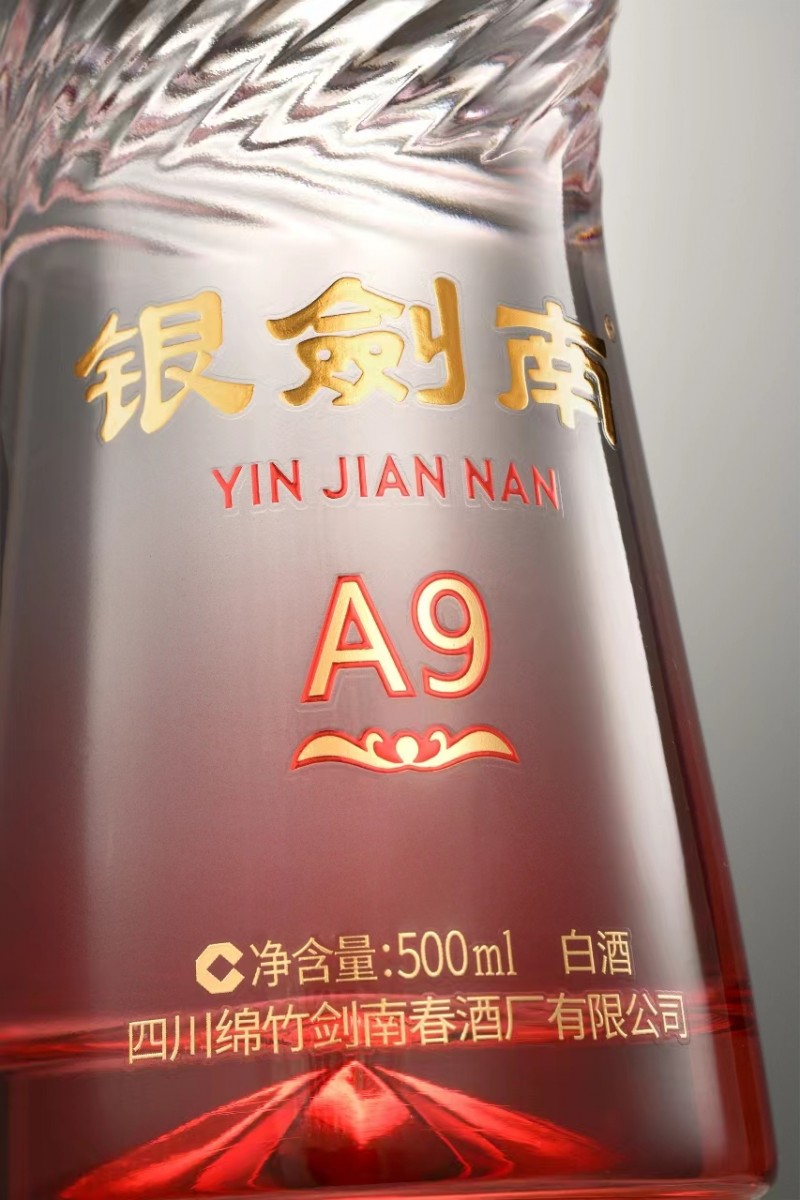 经典的收腰瓶身设计,采用**透光玻璃为材质,从底部向上生长漫延的经典**红渐变,既创造了视觉上的稳重感,又透露着一袭柔和通透之美,与银剑南A9绵软清甜的风格特点**呼应;腰身独特的酒波纹镌刻,理念上源自“一滴聚精华”的品质追求,而功能上,凹凸的握感很好地满足了防滑需求,美观实用兼而具之。外盒包装摒弃了传统的金色,转而采用浓重的**红,喜庆、大气、热闹,更适合老百姓宴会用酒的主题氛围感。