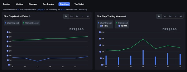 当前 19 只蓝筹合约总市值为 1,741,230 ETH,占 NFT 总市值的 28.67%。