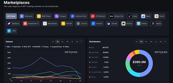 本周:大部分交易市场走势较为平缓,Blur 仍占市场主导,整体交易额在 1 月 18 日达到**,0:00 时 Blur 市场**达 4050 万美元,Opensea **达 1078 万美元。NFTScan 收录 209 个交易市场 7d 总交易额达 $390.3m,整体较上周($340.3m)有 $50m 的上升区间。本周 Blur 交易额排名**,市场交易额分布较稳定,排名前六的交易市场及占比分布: