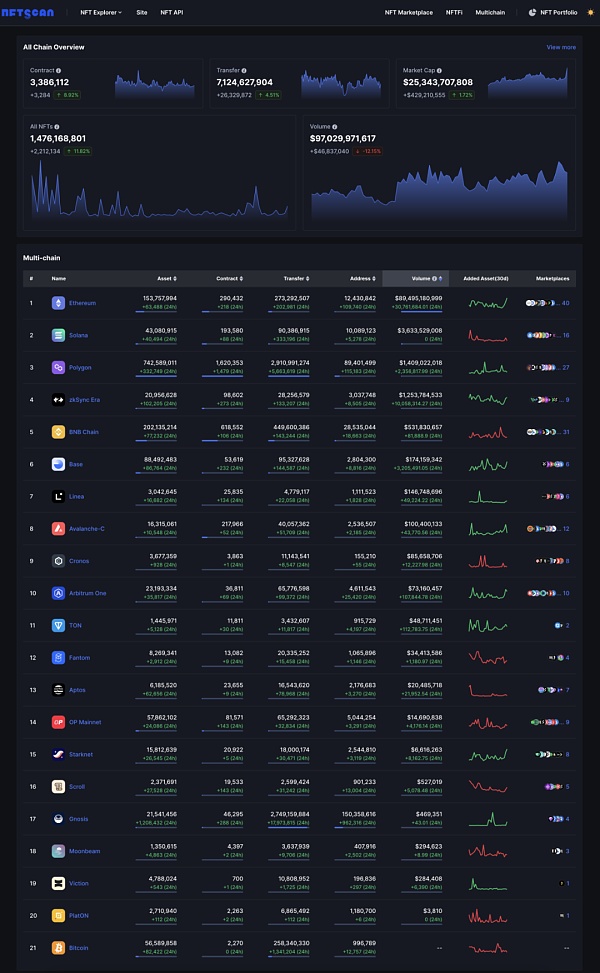 截至 2024 年 1 月 22 日,NFTScan 目前已支持 Bitcoin、Ethereum、BNBChain、Polygon、Solana、Avalanche、Arbitrum、Optimi**、zkSync、Starknet、Aptos、Linea、Base、TON、Scroll、Viction、Fantom、Moonbeam、PlatON、Cronos、Gnosis 21 条主流区块链网络,**生: