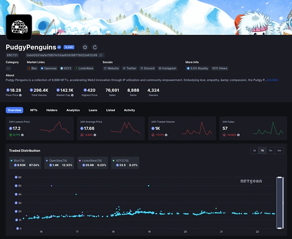 据 NFTScan 数据显示,Pudgy Penguins 目前地板价已达 18.27 ETH,**成交价 420 ETH,7d 交易额为 11,571 ETH,目前以太坊上总交易额已超 296.4k ETH,过去 7 天交易分布主要为 Blur: 9.93k(87.24%),Opensea: 1.4k(12.33%),LooksRare:25.98(0.23%),X2Y2: 23.5(0.21%)单位 ETH,7d 交易笔数高达 715 次。