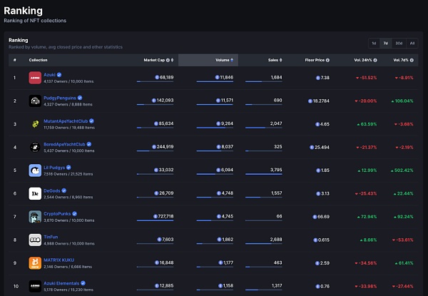 本周 Azuki 位列**,目前地板价依旧稳定在 7.38e 左右,7d 交易额高达 11,846e;PudgyPenguins 以 11,571e 的交易额位列第二,目前地板价为 18.2784e;MutantApeYachtClub 以 9,264e 总交易额位列第三; 蓝筹 NFT 整体市场交易额和地板价呈稳定上升趋势。