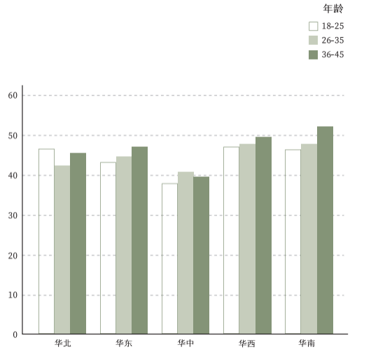 **5大区域女性皮肤色相角平均值整体分布