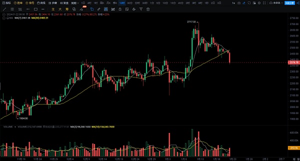 以太坊的盘面KDJ虽然出现缩量,但BOLL和MACD整体还是走强的;主图MA三日各均线也是保持震荡上涨趋势,那么就今天日内以太坊的下跌很明显了是受到了比特币的影响,所以我们就以太坊目前的情况低点关键支撑就参考在周线MA5和MA10日均线区域,当前价格参考在2374-2321区域附近,这轮受到比特币的空头情绪所产生的跌幅,只要其无法有效跌破2374-2321区域则后续币价还将触底回弹拉升(也就是怎么跌下来将怎么回弹回去);反之若低点支撑区域被有效跌破了,那么大盘情况将会产生**的变数,后续以太坊可能会**随着比特币进行崩塌下泄,低点目标也就随之下看至日线的BOLL下轨区域附近,大概价格参考在2200-2127区域附近(不过就以太坊目前大级别的走势而言,跌破的概率是比较低的)。