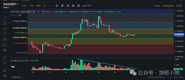 XAI 币的价格已降至斐波那契回撤的0.382水平附近,成交量逐渐减少,多空量能在衰减,出现了一些筑底的迹象。